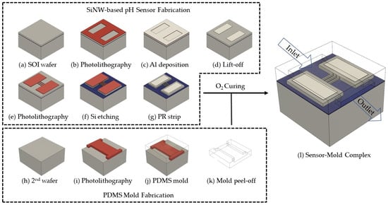 Fabrication process flow of pH sensor based on silicon nanowires: (a) prepared SOI wafer; (b) photolithography of mask for electrodes; (c) Al/Ti deposition using evaporator; (d) lift-off to form electrodes; (e) photolithography of mask for silicon nanowires; (f) fabrication of silicon nanowire array using DRIE; (g) plasma ashing residual photoresist; (h) prepared bare wafer; (i) manufacturing SU-8 mold using photolithography; (j) PDMS casting and thermal annealing; (k) PDMS mold peel-off; (l) integration of PDMS mold and pH sensor with O2 curing.