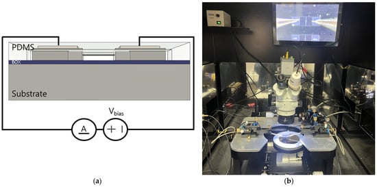 For electrical characterization, a semiconductor parameter analyzer (4200A-SCS; Keithley, Cleveland, OH, USA) was employed. Measurements were conducted using a probe station, where probes were connected to each electrode, as shown in Figure 7. To verify the ohmic contacts of the electrodes, current–voltage (I–V) measurements were performed at room temperature with 30,000 Lux of light. A linear I–V curve indicates good ohmic contact, whereas non-linear behavior may suggest the presence of a Schottky barrier or other contact issues. Current variations were recorded during a voltage sweep from −1 V to 1 V to evaluate the device’s I-V characteristics.