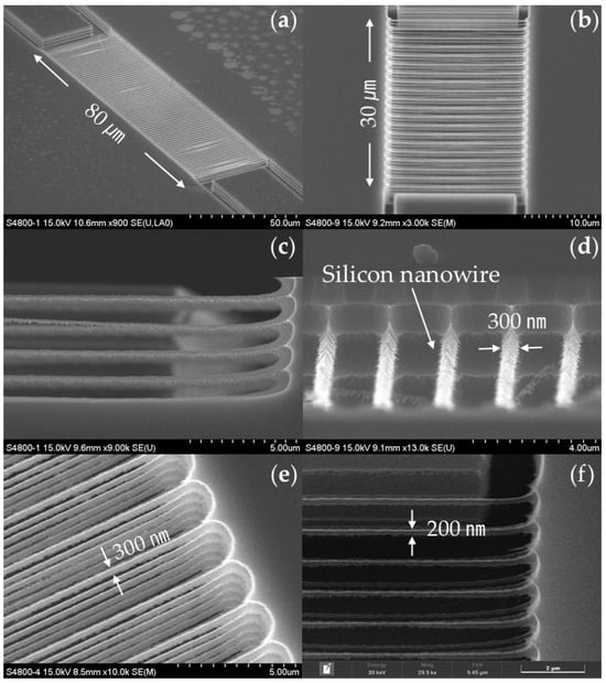 The dimensions and structural integrity of the silicon nanowires were meticulously analyzed using SEM, with representative images included in Figure 8. The SEM analysis confirmed the precise and uniform fabrication of various three-dimensional SiNW arrays, utilizing a specialized BOSCH process recipe alongside conventional lithography techniques, as evident in Figure 8. The arrays featured vertical stacking in distinct layers of two (Figure 8a), three (Figure 8b), four (Figure 8c), and five (Figure 8e), along with arrangements featuring multiple rows of wires. By finely tuning the width of the photoresist pattern, the dimensions of the SiNWs were controlled, facilitating the creation of wires with diameters ranging from 200 nm to 300 nm, as demonstrated in Figure 8e,f. The silicon nanowires exhibit rough surfaces that increase the surface-area-to-volume ratio, as shown in Figure 8d, because of the absence of wet oxidation or wet etching in the process.