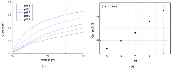 (a) I–V characteristics of the pH sensor in solution with different pH levels. The graph shows the current response of the nanowires as the voltage is varied from 0 to 1 V for pH values of 3, 5, 7, 9, and 11. (b) Current–pH characteristics of the pH sensor with 1 V bias.