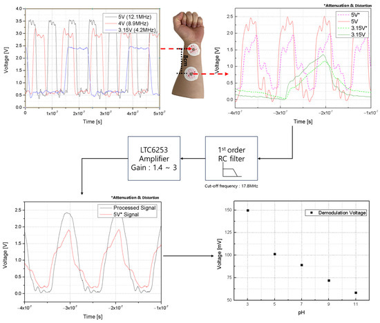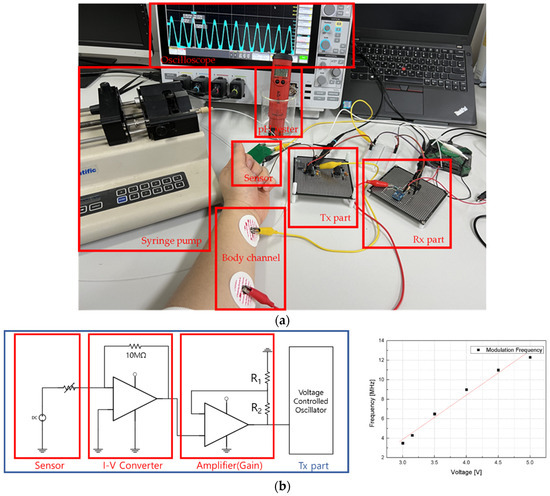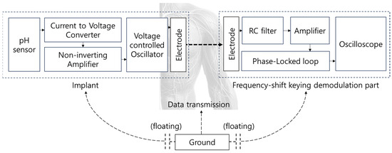 The BCC circuit, designed for implantable devices, begins with an operational amplifier (OPAMP) configured as a current-to-voltage converter [32,33,34]. This is essential for processing the current from silicon nanowires into a usable voltage form. Following this, the circuit includes a voltage-to-frequency conversion step, preparing the signal for frequency-shift-keying (FSK) modulation through a voltage-controlled oscillator (VCO). The VCO adjusts its frequency based on the input voltage, corresponding to the data to be transmitted. FSK modulation is chosen for its simplicity and robustness against signal-level variations, making it ideal for transmission through the human body. The human body acts as the transmission medium, with BCC effectively minimizing distortion and attenuation in the 1 MHz to 10 MHz range [34]. The signal is transmitted using a CD74HC4046AE (Texas Instruments, Dallas, TX, USA). Upon reception, the signal undergoes low-pass filtering to remove high-frequency noise, ensuring data integrity. The FSK demodulation is then performed by the CD74HC4046AE, converting the frequency-modulated signal back into a voltage signal for the receiving device. The experimental setups for the integrated pH sensor and BCC circuit—the FSK modulation and demodulation—to input/output the BCC circuit are detailed in Figure 12. Additionally, Figure 13 provides a comprehensive diagram of the entire system, illustrating the flow and interactions of the various components.