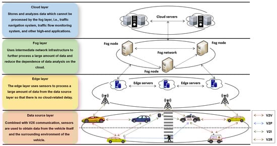 The IoV is an application of IoT in the context of intelligent transportation systems (ITS). The IoV has a similar architecture to the IoT and features a hierarchical structure that includes data source, edge, fog, and the cloud layers []. Vehicles share information with other vehicles, pedestrians, intelligent infrastructure, and backbone networks to establish vehicle-to-vehicle, vehicle-to pedestrian, vehicle-to-infrastructure, and vehicle-to-network communication, thereby formulating vehicle-to-everything (V2X) communication. Figure 1 thus depicts the architecture of an IoV network. The main IoV communication node is a vehicle with an on-board unit (OBU) which can communicate with the Roadside Units (RSUs) and other vehicles in its proximity. Due to the unique characteristics of IoV, i.e., openness, dynamic topology, and high mobility, it is susceptible to attacks; dishonest entities can modify legitimate security messages, spread forged information, or delay forwarding messages, thereby endangering human lives [].
