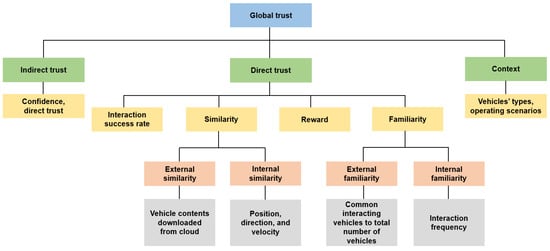 Also, a number of trust models do not take into account the effect of context while ascertaining the trust of a particular vehicle. For instance, an urban scenario involves more vehicles and, therefore, the inter-vehicular interactions are much more as opposed to a highway scenario, wherein it is extremely challenging to establish trust among the vehicles. Similarly, public vehicles, including, but not limited to, police cars, ambulances, and fire brigades have higher trust values in contrast to private vehicles. Moreover, drivers with many years of driving experience generally have higher trust values than novice drivers. This research, therefore, regards two contextual factors, i.e., vehicle types and operating scenarios, in order to obtain a more optimal trust value. Therefore, not only were the direct trust and the indirect trust included in the global trust of our envisaged trust model but the context was also incorporated (see Figure 2).