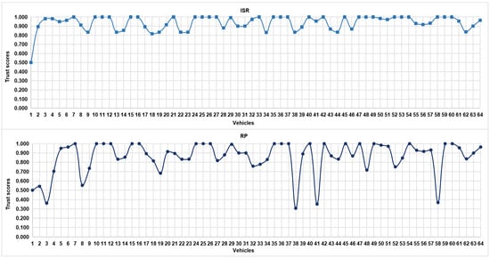 Trust scores of vehicles in an IoV network vis-à-vis ISR and RP (ISR here implies interaction success rate, and RP refers to reward and punishment).