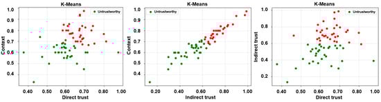 Labels via unsupervised learning (k-means clustering)—direct trust vs. context, indirect trust vs. context, and direct trust vs. indirect trust.
