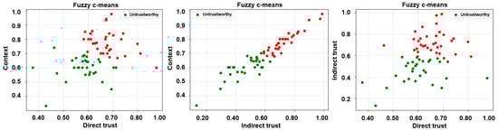 Labels via unsupervised learning (fuzzy c-means clustering)—direct trust vs. context, indirect trust vs. context, and direct trust vs. indirect trust.