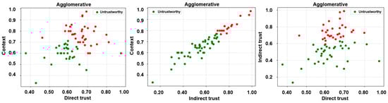 Labels via unsupervised learning (agglomerative clustering)—direct trust vs. context, indirect trust vs. context, and direct trust vs. indirect trust.