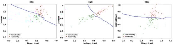 Trust boundary results for KNN algorithm—direct trust vs. context, indirect trust vs. context, and direct trust vs. indirect trust.