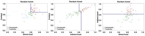 Trust boundary results for RF algorithm—direct trust vs. context, indirect trust vs. context, and direct trust vs. indirect trust.