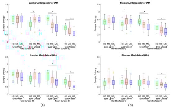 Boxplots present sample entropy (SE) values for both sensors (lumbar and sternum) and both directions (AP and ML) for all four conditions. HC = healthy controls, MSa = pwMS with EDSS ≤ 2.0 (pwMS0–2), MSb = pwMS with EDSS > 2.0 (pwMS2.5–4). * Horizontal lines indicate significant pairwise differences (post-hoc after Bonferroni correction, p < 0.005).