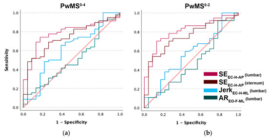 A receiver operating characteristic (ROC) analysis was used to determine the sensitivity and specificity of all SE values and linear metrics (AREO-F-ML and JerkEC-H-ML) to differentiate between HC and pwMS0–4. A secondary ROC analysis was conducted to determine classification performance for mild MS using only the data from 37 participants with an EDSS score ≤ 2.0 (pwMS0–2). The following classification performance based on the area under the curve (AUC) of the ROC analysis was adopted: AUC < 0.6 = fail, 0.6 ≤ AUC < 0.7 = poor, 0.7 ≤ AUC < 0.8 = fair, 0.8 ≤ AUC < 0.9 = good, and AUC > 0.9 = excellent [18]. A correlation coefficient was used to identify potential confounders such as age, height, and body mass index (BMI); no confounders were identified. All statistical analyses were conducted using IBM-SPSS 29 (Armonk, NY, USA).