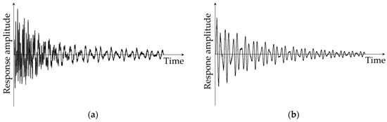 In the second step of the damage identification process, modern signal processing tools are often utilized to detect the damage-induced effects within the measured dynamic responses. Compared to responses obtained from undamaged locations, responses influenced by damage usually contain greater disturbances. Figure 2 schematically illustrates the effects of damage on the amplitude of a time domain response.