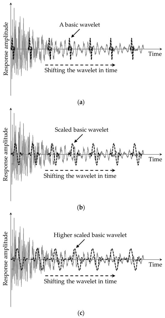 The process of shifting and scaling a basic wavelet function in the CWT of a response: (a) Shifting a basic wavelet in time; (b) Shifting a scaled (low frequency) version of the basic wavelet in time; (c) Shifting a higher scaled (lower frequency) version of the basic wavelet in time.