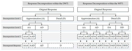 The lack of filtration in the detail coefficients of the DWT results in relatively low resolution, especially in the high-frequency region, posing challenges in disclosing the hidden characteristics of the response. To surmount these challenges, researchers have turned to another discrete wavelet transform, known as wavelet packet transform (WPT) [,,,,]. Both the DWT and WPT decompose a given signal into low- and high-frequency components. However, while the DWT repeatedly decomposes only the low-frequency component, the WPT decomposes both the low- and high-frequency components at each level of decomposition. Consequently, the WPT provides richer information on high-frequency components by breaking them down into smaller packets leading to higher resolutions. Figure 4 visually illustrates the comparison between the DWT and WPT across three levels of decomposition.