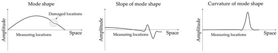 Generally, the space domain-based techniques are based on the premise that intact structures (i.e., at the reference state) exhibit smooth mode shapes, while damages introduce abrupt shifts in the slope of mode shapes or sudden peaks in curvature near the damaged locations []. Figure 5 illustrates an example of such damage-induced effects in a mode shape and its derivatives. Given that baseline mode shape data for structures in their reference state are typically unavailable, researchers often substitute them with smoothed versions of mode shapes derived from the damaged structures (i.e., the current state). Most space domain-based investigations have focused on assessing the efficacy of diverse curve-fitting methods for obtaining the smoothed mode shape curves, which serve as baselines for comparison with mode shape data points extracted from the damaged structures. This comparison facilitates precise localization of the damage.