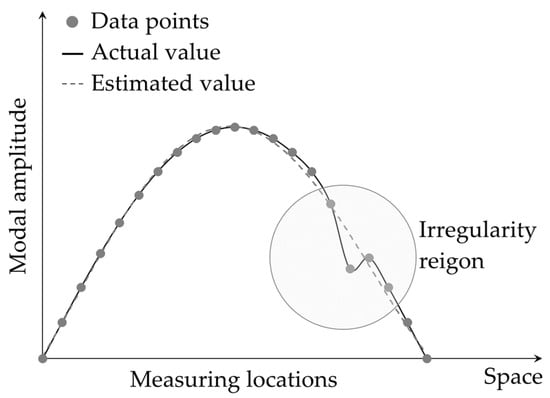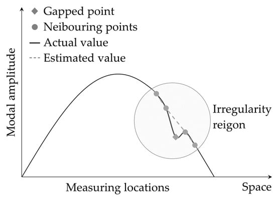 This procedure was later referred to as the gapped smoothing method (GSM) for damage detection []. The GSM is in fact a local curve-fitting method that utilizes a cubic polynomial function with neighboring four data points from a gapped middle point. Figure 7 depicts the basic idea of the GSM that the value of a data point on a smooth modal curve (i.e., the baseline) can be accurately estimated by the neighboring data points unless the point is in a region with damage-induced irregularities. Therefore, the difference between the actual value of the data point and its estimated value can be used to quantify the damage-induced irregularities in the curve.