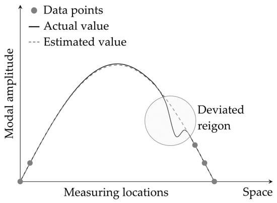 Despite the successful applications of GSM-based and similar damage detection techniques [], certain challenges, such as the smearing effect on the edges of damage and fault detections near the boundary edges, have prompted researchers to seek improvements. In response, Yoon et al. [] introduced the global fitting method (GFM) as a means of enhancing damage localization in beam-like structures, building upon previously developed methods. While the GSM technique involves local curve fitting (refer to Figure 7) of the mode shape curvature, the GFM is a global curve fitting (refer to Figure 8) for the entire mode shape. The GFM is particularly interesting for representing the baseline mode shape data because mode shapes generally reflect the global dynamic behavior of structures. Therefore, calculating curvature of the mode shape obtained by the GFM provides a more accurate estimation of the reference state compared to that derived from the GSM. Improved quality of baseline data can reduce errors and enhance the precision of damage detection. In essence, the GFM utilizes a generic form of mode shape, expressed in Equation (7), to fit a smooth curve to the all the mode shape data points.