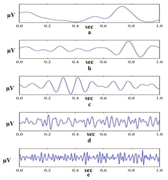 Example of EEG decomposed into its frequency bands (From top to bottom: The delta, theta, alpha, beta, and gamma frequency bands) [19].