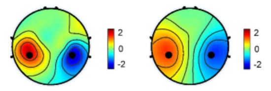 One particularly effective spatial filter is the Common Spatial Patterns (CSPs), which has demonstrated success in extracting sensorimotor rhythms and can be employed in real-time in brain-computer interfaces. International competitions have further demonstrated the effectiveness of spatial filters in conjunction with machine learning models [103,104,105]. In addition, their application in classification problems, spatial filters can also enhance the signal-to-noise ratio in regression-based problems [106] or accentuate differences in power between various imaging conditions [107], as shown in Figure 3.