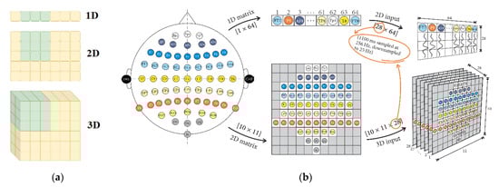 Standard implementation of data transfer for 1D, 2D and 3D formats (a) Chollet et al. [171] location of electrodes on the matrix according to the placement on the scalp, (b) Sugi et al. [172].