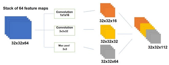 Illustration of the Inception module implemented with input data of 32 × 32 × 64 and output data of 32 × 32 × 16, 32 × 32 × 32, and 32 × 32 × 64.