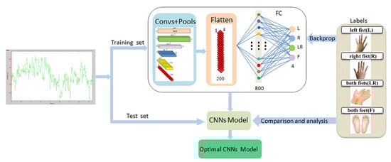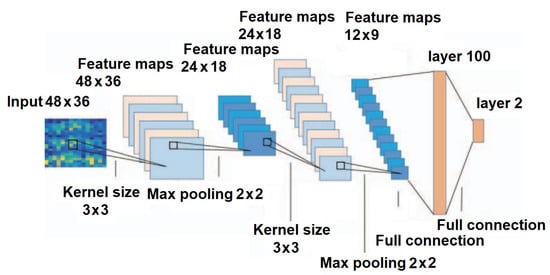 The EEG signal carries valuable information at specific frequency ranges: alpha (8–13 Hz), beta (14–40 Hz), theta (4–8 Hz), delta (0.5–3 Hz), gamma (above 40 Hz), and more. Each of these frequencies has its own unique characteristics and applications [196]. Since the frequency ranges and their characteristics have been extensively studied [197,198], many researchers have decomposed EEG signals into their frequency components and then fed the data into a CNN. It is important to note that one of the advantages of a CNN is its ability to discover dependencies that may elude human observation. Therefore, it is advisable to examine the raw data and exercise caution to prevent overfitting. In light of this, Zhang et al. [199] employed the short-time Fourier transform (STFT) method for frequency decomposition of the EEG signal to detect motor activity. The resulting data were then input into a 7-layer CNN designed for classification tasks with various core layers of 3 × 3, 2 × 2, and 3 × 3. In this CNN, the last two layers were fully connected layers, comprising 100 and 2 neurons, respectively, with the SoftMax classifier, as shown in Figure 9.