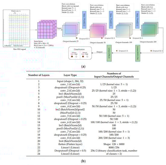 Wang et al. [202] introduced an 8-layer CNN designed for emotion recognition. The model’s input size was determined as width × height, where the width corresponded to 32 (representing the number of electrode channels), and the height was set at 3 × 128 = 384 (calculated as the product of the window size, 3 s, and the sampling frequency, 128 Hz). The batch size used for the model was set to 128, indicating the amount of data used in each batch. In the proposed model, Conv2 represents a multidimensional (2D) convolutional layer, Pooling2D stands for maximum 2D pooling, BatchNorm2d denotes 2D batch normalization, and Liner signifies a fully connected layer. Each convolutional layer is followed by an activation layer, Leaky ReLu. As a result, the architecture comprises eight convolutional layers, four batch normalizations, four dropout layers with a probability of 0.25, three maximum pooling layers, and two fully connected layers. The 5 × 1 convolution kernel folds the data in the temporal direction, while another 1 × 3 convolution kernel handles data folding in the spatial direction. The first three convolution blocks are connected to the maximum pooling layers at the end, and the architecture culminates in a fully connected layer utilized for emotion recognition classification. This comprehensive, lightweight model has a high degree of generalization and versatility, with an emphasis on real-time wearable applications. The visual representation of this architecture is shown in Figure 11.