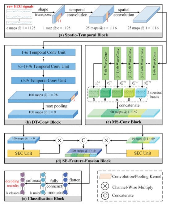 - Li, Y.; Guo, L.; Liu, Y.; Liu, J.; Meng, F. A Temporal-Spectral-Based Squeeze-and- Excitation Feature Fusion Network for Motor Imagery EEG Decoding. IEEE Trans. Neural Syst. Rehabil. Eng. 2021, 29, 1534–1545. [Google Scholar] [CrossRef]