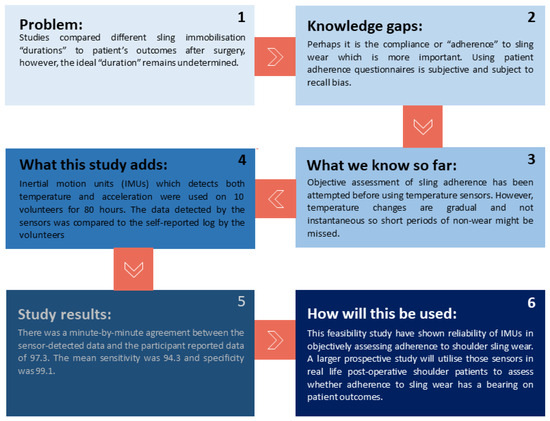 Assessment of sling wear adherence has been attempted before using temperature sensors. Sood et al. cross-referenced self-recorded sling wear in four participants with data logged from temperature sensors fitted to the slings to develop an algorithm for validating actual wear adherence [