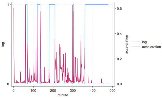 Different time constants were used for temperature and acceleration as temperature changes occur more slowly compared to acceleration. Thus, a shorter time constant for acceleration is necessary to capture quick detection of device removal or non-wear, while a longer accounts for the slower changes that are evident with temperature. This approach allows us to identify non-wear periods in a manner that accounts for short-term fluctuations while maintaining a continuous assessment of the data [