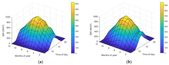 It is also important to perform a graphical analysis of the data to identify trends and patterns. In this context, the GHI variable is used as a reference and analyze its average behavior concerning both the time of day and the month of the year, as illustrated in Figure 3.