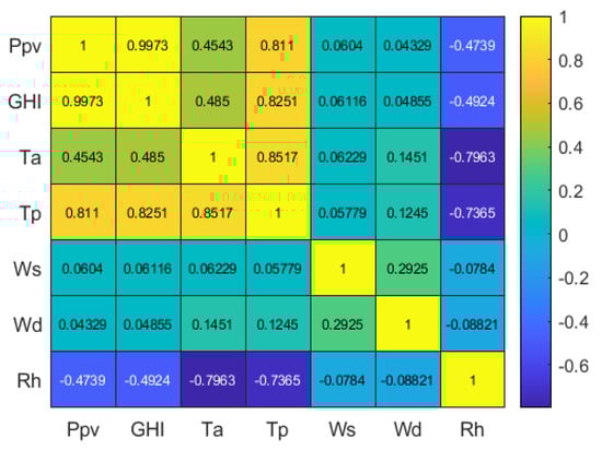 When working with a dataset that includes measurements of various variables, it is important to analyze and determine which variables have the most significant impact on PV power prediction. Adding more input features does not necessarily lead to better results. In fact, including inappropriate input features can introduce noise and reduce the quality of predictions. One commonly used method in the literature for selecting input features in a prediction model is Pearson’s correlation [31]. This method is based on determining the strength and direction of the linear relationship that exists between each independent variable and the target variable (represented in this case by the Ppv). The Pearson correlation coefficient (PCC) is calculated as follows: