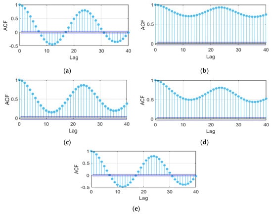 Autocorrelation function (ACF) for the input variables to the prediction model: (a) GHI time series; (b) Ta time series; (c) Tp time series; (d) Rh time series; and (e) Ppv time series.