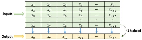 Another important aspect to analyze is the adaptation of the data format. Figure 7 shows a general scheme of the structure used for the dataset. In this structure, the variable x represents the set of input characteristics, that is, ; represents the forecast of the next hour’s Ppv. The variable n represents the number of observations used in the study, such that , where N is the total number of observations in the dataset and l is the number of lags used. In this case, the data have been organized in such a way that there is a shift of two-time steps between the input variables and the corresponding output, with a time resolution of 30 min and a forecast horizon of one hour.