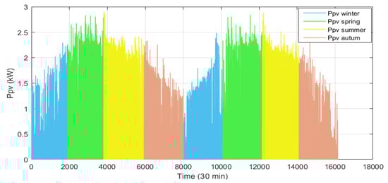 PV energy production is zero during the night hours, making it possible to exclude these values without compromising the performance of the prediction model and the quality of its predictions. This is beneficial for model training, allowing the computational load and training time to be reduced. However, it should be noted that the sunrise and sunset times vary according to the seasons, and this is an important aspect that should be considered in order not to affect the quality of the dataset [30]. In this work, a filtering of the night values is implemented, taking into account these aspects, in order to guarantee the integrity of the data throughout the entire analyzed period.