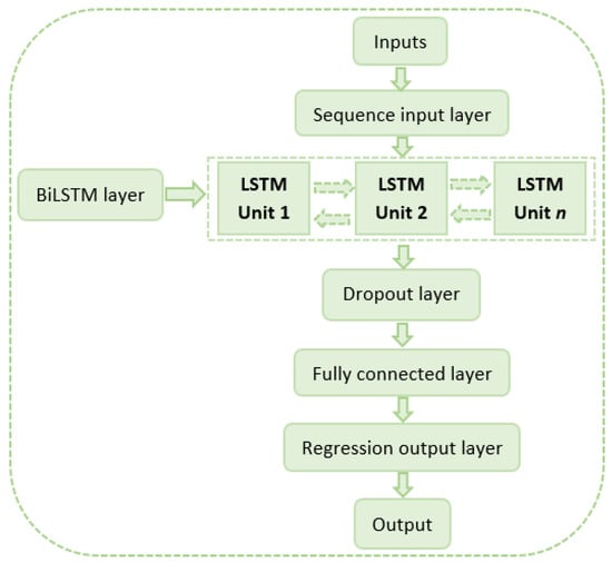 The general architecture of the implemented prediction model is shown in Figure 9 and consists of the following elements: inputs, sequence input layer, BiLSTM layer, dropout layer, fully connected layer, regression output layer, and output.