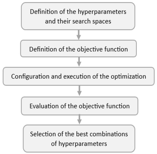 Bayesian optimization is suitable for problems of high dimensionality and with objective functions that are costly to evaluate, as is the case of hyperparameter optimization in DL models. BOA is based on Bayes’ theorem and uses two fundamental elements in its operation: the surrogate probability model and the acquisition function. The combination of both elements provides BOA an adaptive and probabilistic nature. In addition, it allows it to find efficient solutions in the search space with a smaller number of evaluations of the objective function and to adapt to limited computational resources [32,33]. An overview of the main aspects that integrate the BOA used in this work is presented in Figure 10.