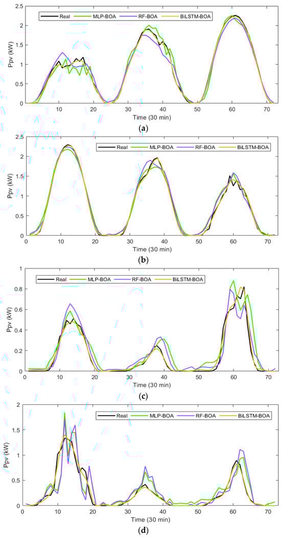 Compared with the hybrid forecasting model (IF-ELM) presented in reference [12], the BiLSTM-BOA model presented in this work shows a slightly lower value in terms of R2, but achieves lower values of nMAE and nRMSE. However, reference [12] only uses as inputs to the model the time series of Ppv and its lags, while in the present study other exogenous variables are considered as inputs to the model. On the other hand, the data used in [12] come from an arid climate region, with more stable climatic conditions.