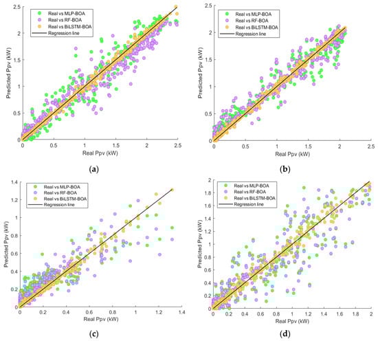 In the case of the hybrid model (SVR-CSO) of reference [35], the reported prediction errors are larger compared with the model proposed in this work. Finally, the hybrid model (GWO-GRNN) of reference [37] shows a lower nMAE value than that obtained by the BiLSTM-BOA model, although the R2 value of the latter is much higher. It should be noted that reference [37] normalizes its errors with respect to the nominal capacity of the plant, while in this work the normalization is performed with respect to the maximum value recorded in each test set. However, the normalization with respect to the nominal capacity of the plant is not recommended when the actual Ppv values are far from the nominal value since an underestimation of the prediction errors can be obtained.