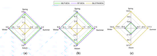 Regarding the normalized errors, the superiority of the proposed model in each test condition is evident. As for the training times, the MLP-BOA model shows the shortest times, closely followed by the RF-BOA model and finally by the BiLSTM-BOA model, which shows the highest times. In the latter case, since it is a DL model with a more complex architecture, the computational cost is higher. Nevertheless, the times obtained are considered reasonable, even for on-line forecasting applications that require frequent retraining of the model. On the other hand, the differences in training time for the different seasons may be related to variations in the hyperparameters of each model, since the proposed fitting is different for each dataset.