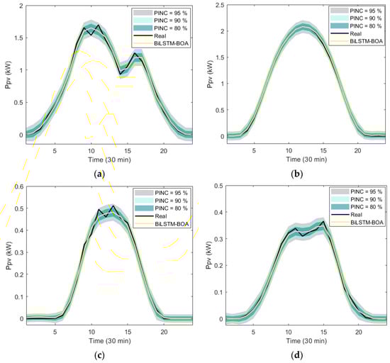 Prediction intervals obtained for a representative day of each season of the year, using different PINC values (80%, 90%, and 95%): (a) spring season; (b) summer season; (c) autumn season; and (d) winter season.