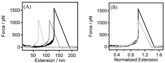 (A) Typical single-chain F–E curves of PEG obtained in DI water, and (B) the normalized single-chain F–E curves of those shown in (A).