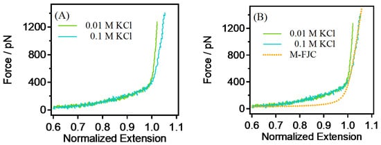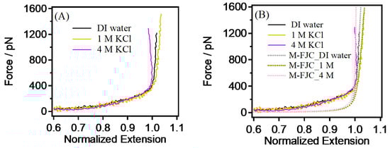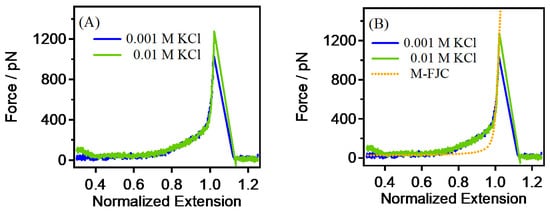 As shown in Figure 2A, the PEG chains showed similar single-chain elasticity in 0.001 M and 0.01 M concentrations of the KCl solution. In order to achieve a better understanding of the pattern of changes in PEG with a salt-ion concentration, a semi-quantitative fitting method was used to quantify the single-chain rigidity of PEG. The M-FJC model, grounded in the Langevin function, characterizes a polymer as a series of statistically independent segments. It is noteworthy that, while the Langevin function (FJC model) is rooted in rigorous statistical mechanics, the modification should be perceived as an empirical model [41,42]. The determination of the end-to-end distance is facilitated by the mathematical expression of the M-FJC model: