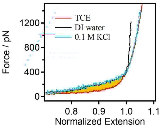 In order to further explore the pattern and limits of the reduction in PEG single-chain rigidity under the influence of salt ions, the single-chain natural elasticity of PEG was obtained. The natural elasticity of PEG refers to the single-chain elasticity presented without external interference. Generally, a vacuum is considered to be the ideal environment for obtaining the natural elasticity of polymer single chains, but due to instrument limitations, a vacuum environment cannot be provided. As a result, nonpolar organic solvents with only weak van der Waals interactions become a good substitute for a vacuum environment (trichloroethylene, TCE, in this paper). As can be seen in Figure 4, the F–E curves of PEG single chains in water are higher in the low-force region and in the medium-high-force region than they are in TCE. Calculations give an energy difference of 4.4 kJ/mol between the energy required for the rearrangement of bound water in PEG in water and in TEC (the area of the yellow part in Figure 4). It has been shown that, for PEG in the low-force region, PEG has a stabilized bound water due to the formation of a Z-type structure [41], resulting in the higher consumption of energy needed for the stretching process. In the middle- and high-force regions, the rigidity of the polymer single chain is also higher than it is in its natural state. Oxygen atoms on the PEG chain form hydrogen bonds with water molecules, leading to the formation of a hydration layer around the PEG chain. This hydration interaction can enhance the rigidity of the PEG chain, as the presence of water molecules influences the conformation of the chain. While PEG molecules are typically nonpolar, the presence of water can influence their charge distribution. The polarity of the water molecules might lead to changes in the charge distribution on the PEG chain, affecting the interactions and rigidity between neighboring chains. Meanwhile, it can be found that the rigidity of the single chain of PEG can coincide with its natural rigidity when the salt concentration reaches 0.1 M, indicating that the electrostatic repulsion of the single chain of PEG can be almost shielded at this time.