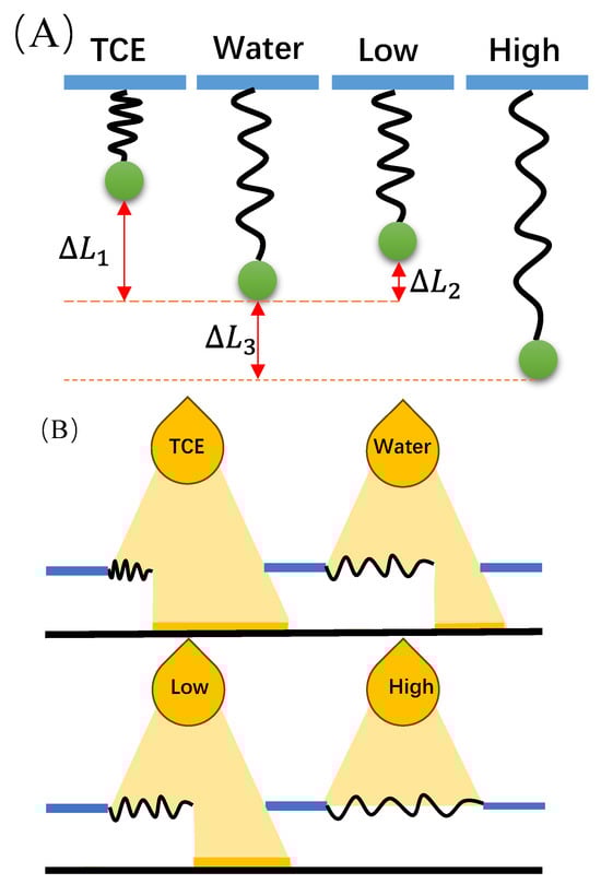 As a conformationally tunable element, PEG can regulate its conformation through the surrounding environment, which provides a new idea for the design of environmentally sensitive sensors. The solvation layer surrounding PEG chains plays a pivotal role in determining their conformation. By altering the concentration of PEG solutions, one can regulate the stretching state of PEG chains, thereby influencing the specificity and sensitivity of the sensor surface [21,22]. Leveraging the conformational adjustability of PEG chains enables the design of sensors with intelligent responses. Under specific conditions, the expansion and contraction of PEG chains can be employed to modulate sensor switching behavior, enabling intelligent sensing and control in particular environments [23,24]. The solvation behavior of PEG chains significantly influences ion-specific effects [25,26]. Through the modulation of the PEG chain’s conformation, one can fine-tune a sensor’s selective responses to various ions, presenting novel perspectives for the advancement of ion sensors.