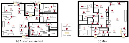 The experiment utilized three smart home datasets: Aruba-1, Aruba-2, and Milan, publicly available from the CASAS project [26]. These datasets involve motion sensors, door closure sensors, and temperature sensors, with the floor layout depicted in Figure 2. Temperature sensors were excluded from feature extraction and model training. Both motion sensors and door closure sensors used the same feature extraction method in the model.