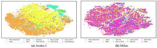Figure 3 visualizes the feature representations for Aruba-1 and Milan using the t-SNE algorithm [56] to project high-dimensional representations into two-dimensional space. These representations were generated by the outputs of the AttCLCHAR model’s pre-trained encoder using unlabeled data and were then evaluated using 20% of the total data. Aruba-1 shows superior visualization representation compared to Milan, aligning with the F1 scores and accuracy results presented in Table 7 and Table 8. Although the model effectively learns the majority of activities, imbalanced activity impacts its performance, a challenge that will be tackled in future work.