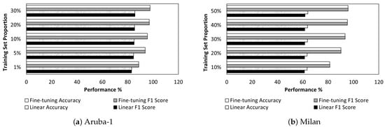 Furthermore, it demonstrates that as the proportion of the training set for Aruba-1 increases from 1% to 10%, the F1 score of fine-tuning improves by a higher percentage. Similarly, Milan shows more performance improvement from 10% to 30% than from 30% to 50% for fine-tuning. This finding suggests that high accuracy can be achieved even with a small number of labeled samples.
