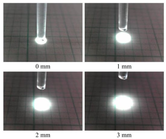When light entered the POF, it underwent multiple reflections owing to the contrast in the refractive indices of the core and cladding. Consequently, the light emitted from the POF tip exhibited marginal dispersion. A POF tip that was positioned at a distance of 3 mm from the grid paper revealed a light spot with a diameter of approximately 2.5–3 mm, as shown in Figure 2.