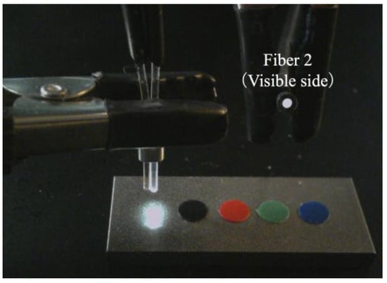 Based on the observed light behavior at the POF tip, an introductory experiment employing two POF cables to show a basic and important ability to recognize change in the appearance or color of the observed spots prepared on the surface of the metal plate, was performed. Initially, two POF cables, namely Fibers 1 and 2, were prepared, and their tips were placed adjacent to each other after stripping approximately 20 mm of the insulation (as illustrated in Figure 4). This sensor, comprising two POF cables, was denoted as an R2 sensor. The name arose from its capacity to detect alterations in the condition of an arbitrary object based on the reflection of light from the surface in front of the sensor. As illustrated in Figure 5, circular vinyl tape segments (5 mm in diameter) in black, red, green, and blue colors were fixed to a steel plate (15 mm wide, 38 mm long, and 3 mm thick). Light reflected from the surface of the steel plate (without tape), positioned approximately 3 mm in front of the R2 sensor, was directed onto Fiber 2, establishing an initial state that could be examined from the opposite end of the POF. Subsequently, the steel plate was incrementally shifted to the left, and the reflected light was recorded by Fiber 2 at each stage as the R2 sensor tip passed above the tapes of distinct colors, as shown in Figure 6. The changes in the optical conditions in the area in front of the R2 sensor, primarily related to color changes, were recorded. This suggested that the R2 sensor can identify variations in the optical conditions attributed to metal corrosion.
